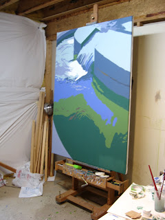 I have been busy over the last few weeks working on several large paintings, which has proven to be a big challenge. The above painting is the first to come off the easel, and is about as big as I can effectively paint in my basement studio. Here is a shot of what it looked like on the easel, to give you an idea of the scale.